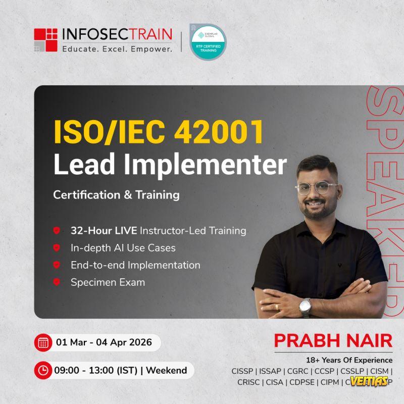 - AI governance is no longer optional. InfosecTrain’s 𝗜𝗦𝗢/𝗜𝗘𝗖 𝟰𝟮𝟬𝟬𝟭 𝗟𝗲𝗮𝗱 𝗜𝗺𝗽𝗹𝗲𝗺𝗲𝗻𝘁𝗲𝗿 𝗧𝗿𝗮𝗶𝗻𝗶𝗻𝗴 is a hands-on, expert-led program designed to help professionals implement, manage, and audit 𝗔𝗜 𝗠𝗮𝗻𝗮𝗴𝗲𝗺𝗲𝗻𝘁 𝗦𝘆𝘀𝘁𝗲𝗺𝘀 (𝗔𝗜𝗠𝗦) aligned with the world’s first AI governance standard.
